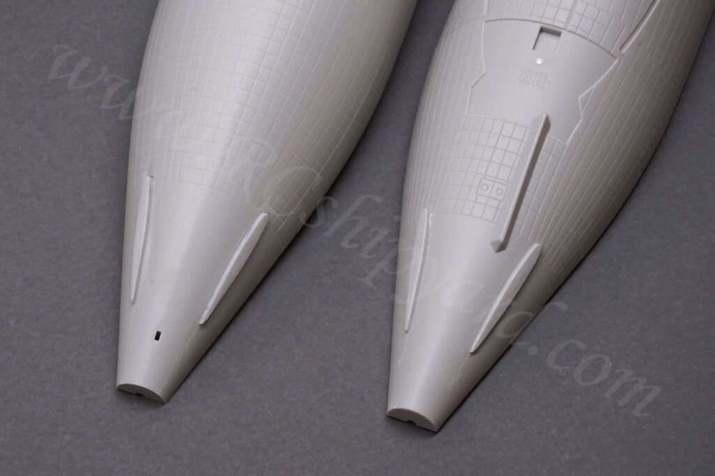 The stern pylon – the one in the middle needed most work, as I had to remove it completely leaving a flat, almost smooth surface. After all – the stern of boat is the place where the x-rudder mechanism will be and the space is very limited there: