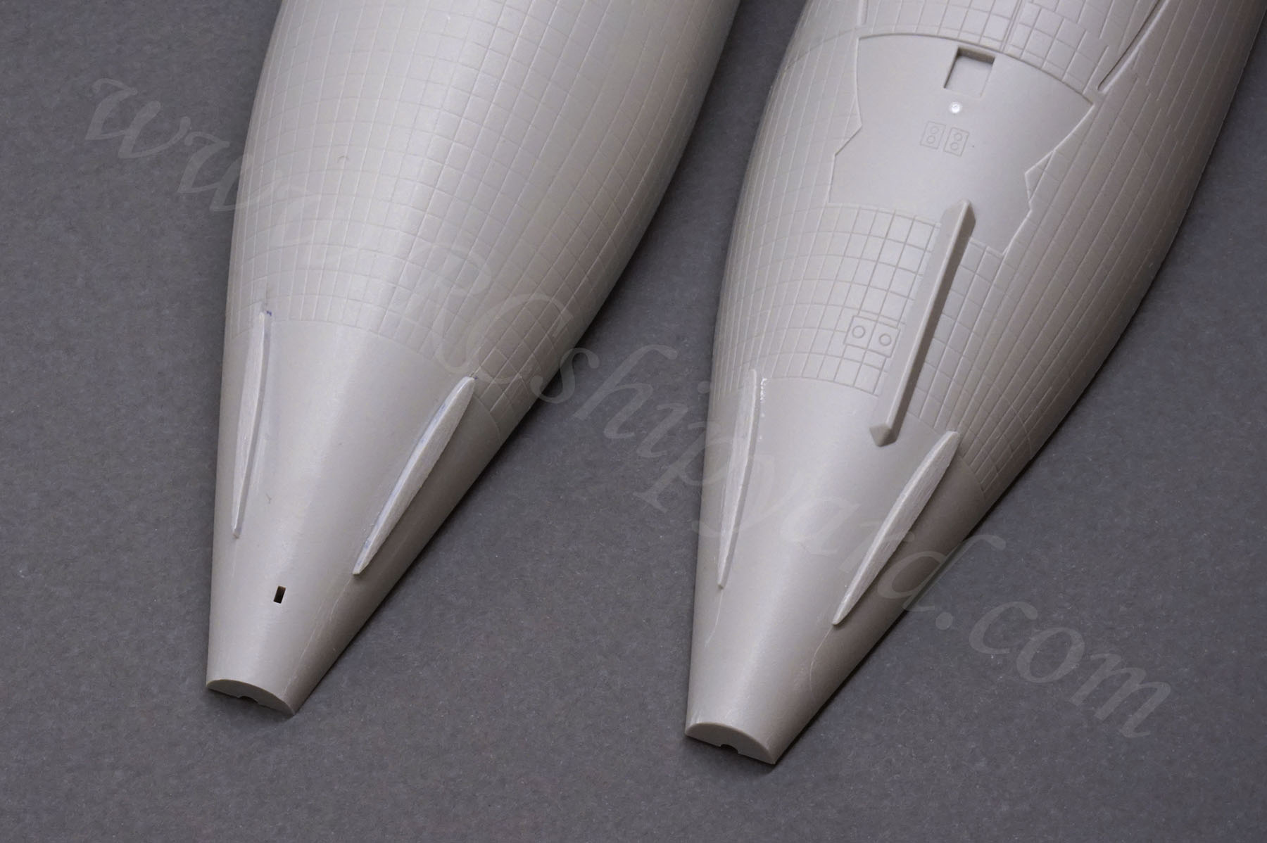 I started by taking measurements to check how much space for a WTC is available inside the hull. As you can clearly see, a WTC designed for the Trumpeter Kilo fits with ease and that was my first idea. Of course, before I was able to insert the tube and see how it fits, I had to cut off the pylons on the lower (and upper) shell. I have removed the three pairs in the middle, leaving three pylons in the bow and two in the stern as those might be handy for later use:
