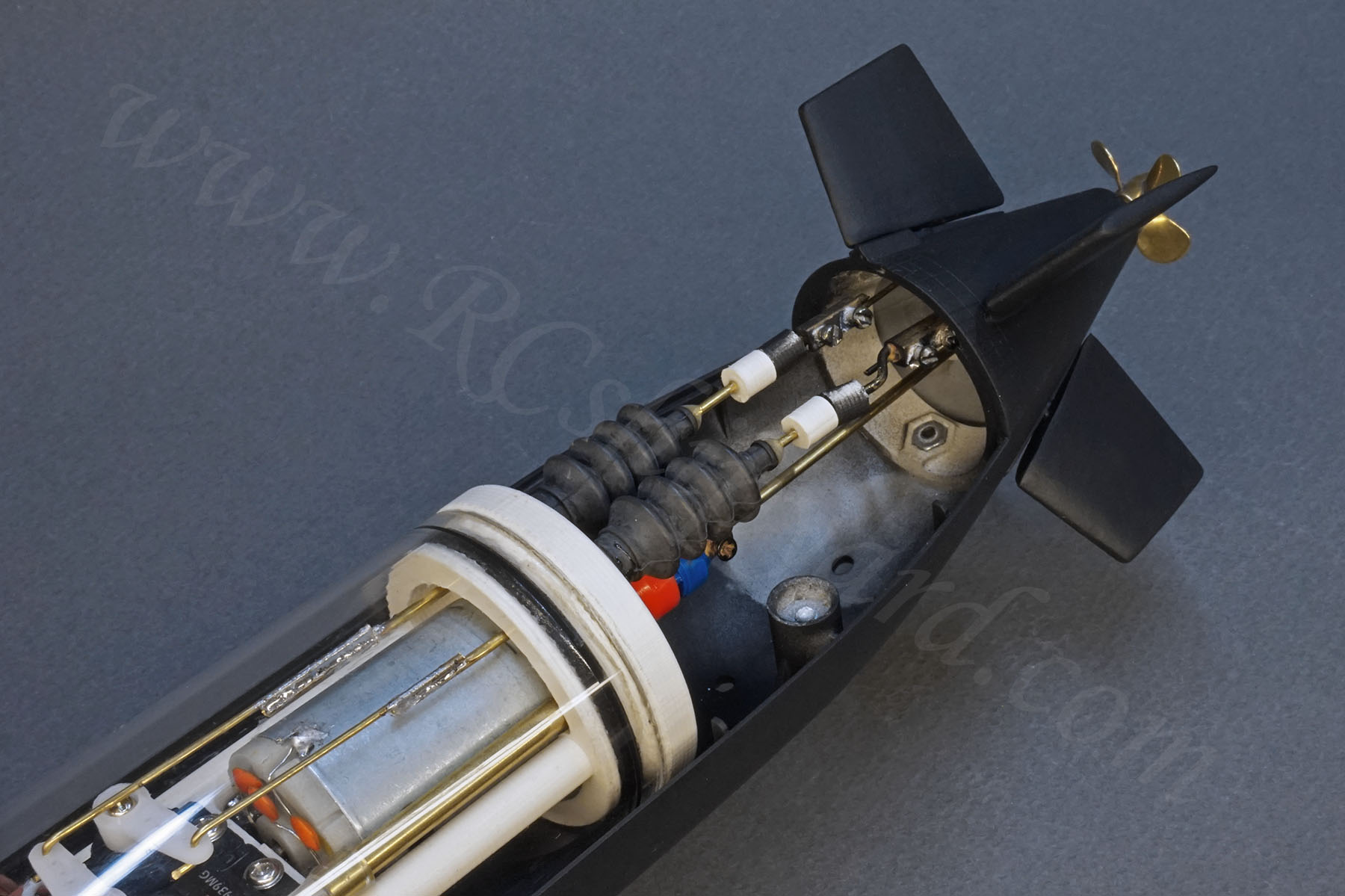 The operational fairwater planes required a modification of the WTC. As I have written at the very start of this building thread – you can use the WTC from the Kilo in this model and it works fine, but then you have only operational stern planes. This is a X-rudder boat, so you cannot simply use an extension of the pushrod from the stern towards the bow (like in the Kilo model). For the operational fairwater (or bow) planes in any X-rudder boat you’ll need a third servo and the Kilo WTC is simply to small for that. I had to find some space for the additional servo and the lengthening of the polycarbonate tube was the only solution. This of course caused the change of volume and buoyancy of the cylinder, so I had to recalculate the size of the ballast tank and increase it’s size accordingly. Luckily It was all manageable and that’s how a third WTC type was born in my family of 50mm WTC tubes.